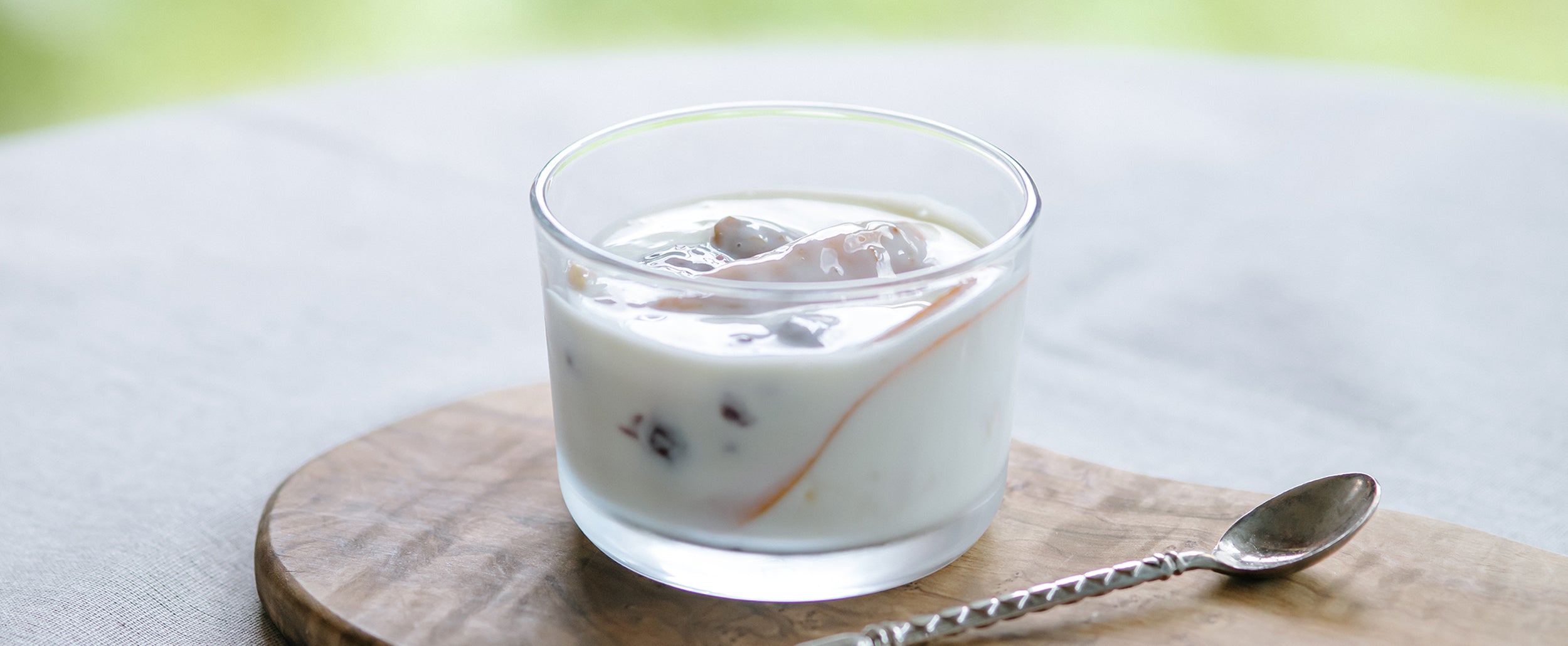 一晩寝かせるとドライフルーツが水分を吸収してふくらみ、ヨーグルトのテクスチャは重めになります。