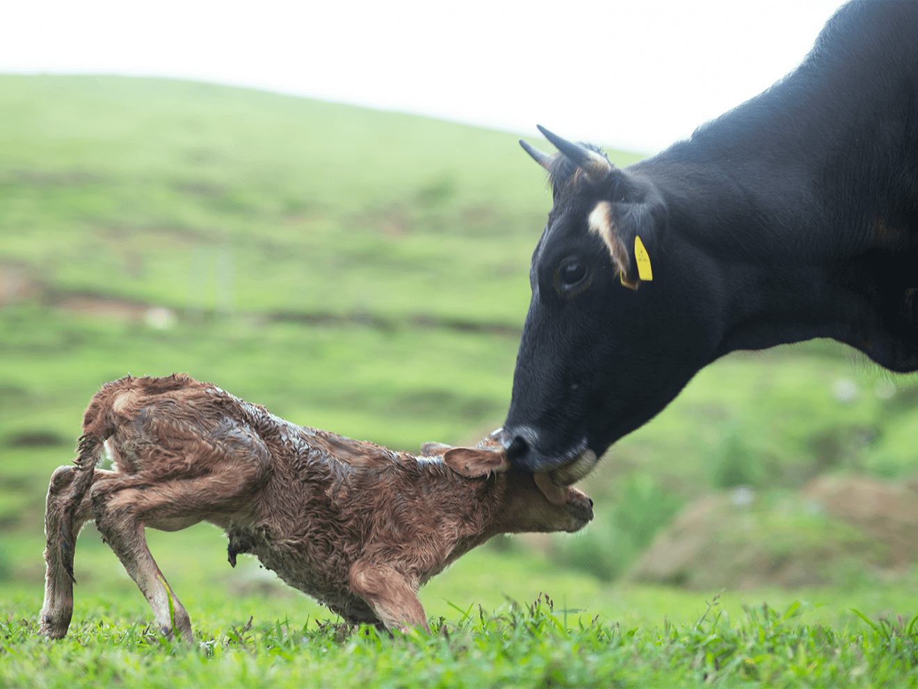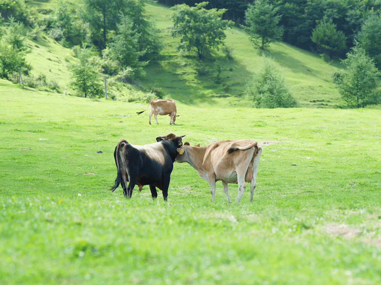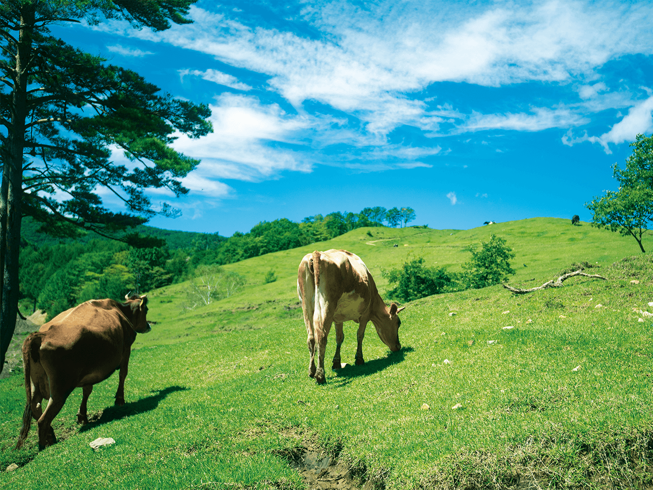 広い山に一年じゅう昼も夜も放牧し、食事・睡眠・排泄はもちろんのこと、 交配・分娩・哺育までを全部ウシまかせにしているため、ストレスとは無縁。