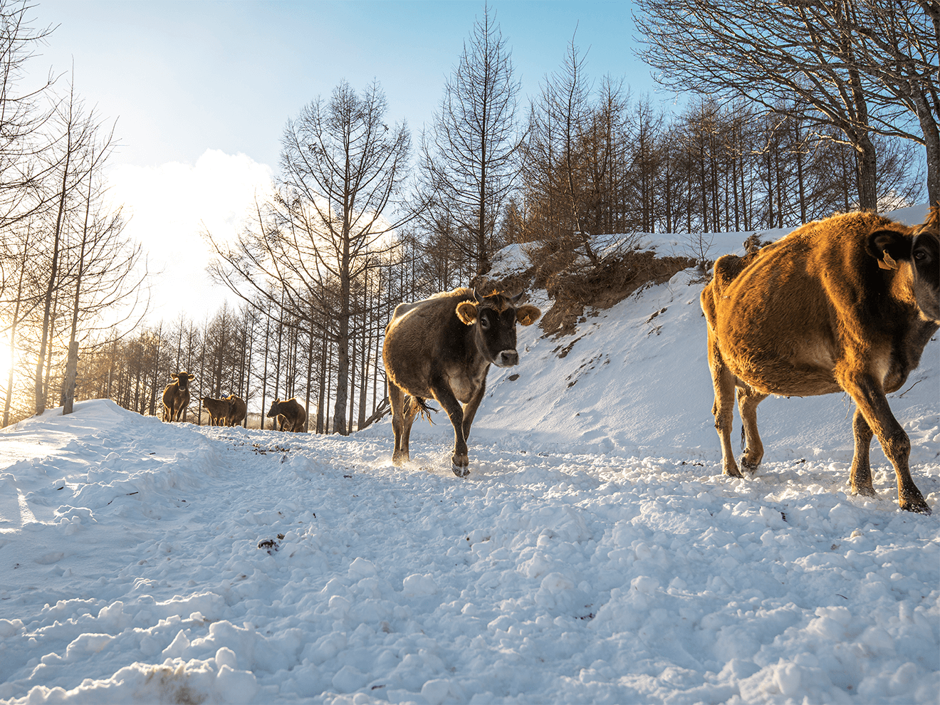 山全体がウシの棲みかなので、牛舎はありません(搾乳舎はあります)。 冬でも山に帰っていく姿には、酪農家の皆さんも驚きます。