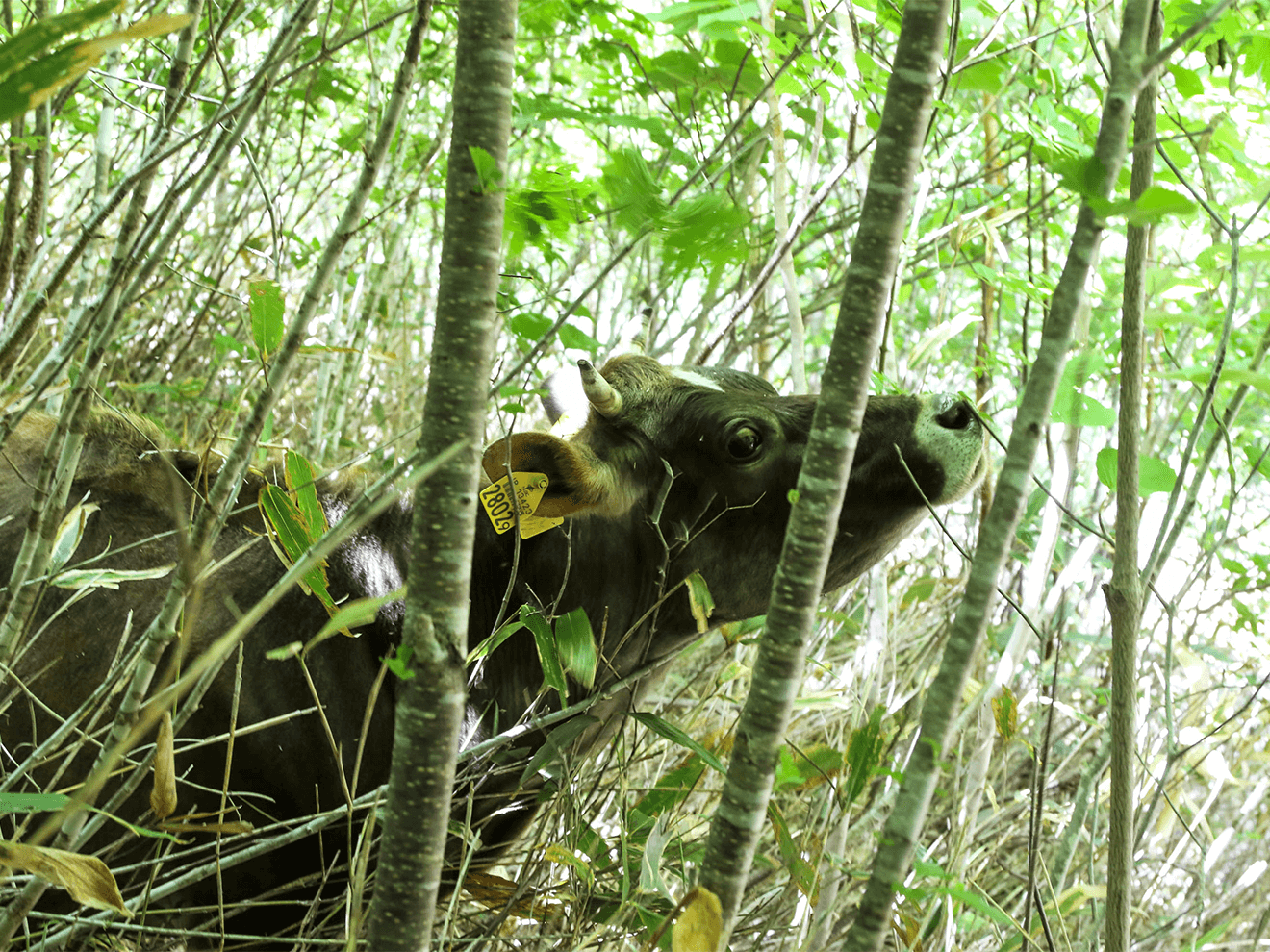 温暖多雨な日本の山林は地力が豊か。野シバだけでなく、野草・クマザサ・木の葉など、ウシの好物がたくさん生えています。そんな自然を生かさない手はありません。