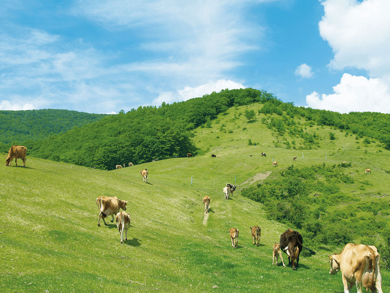 岩手県の約6割を占める北上山系は、 なだらかな地形に楓・松・楢などの山林が広がり、野生動物も多く生息する自然豊かな土地。 なかほら牧場はその北上山系の標高700~850mの窪地に位置し、 平らな牧草地ではなく山の植生を活用する「山地(やまち)酪農」という手法を用いて “牛なり・山なり・自然なり”の放牧酪農を行っています。