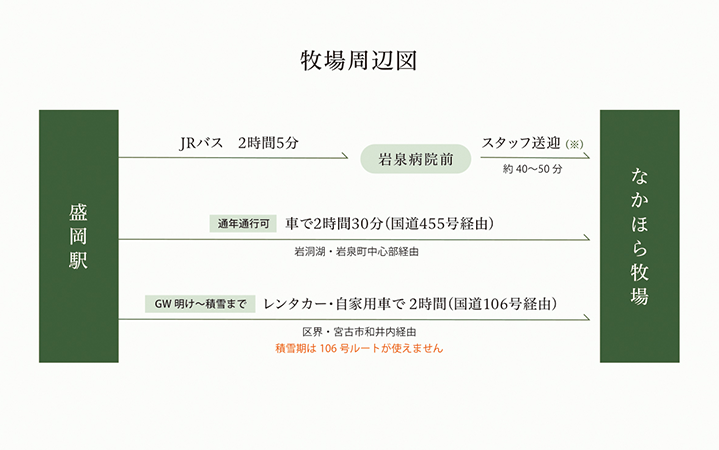 送迎はJRバス東北 最寄駅[岩泉病院前]←→[牧場]の往復です。